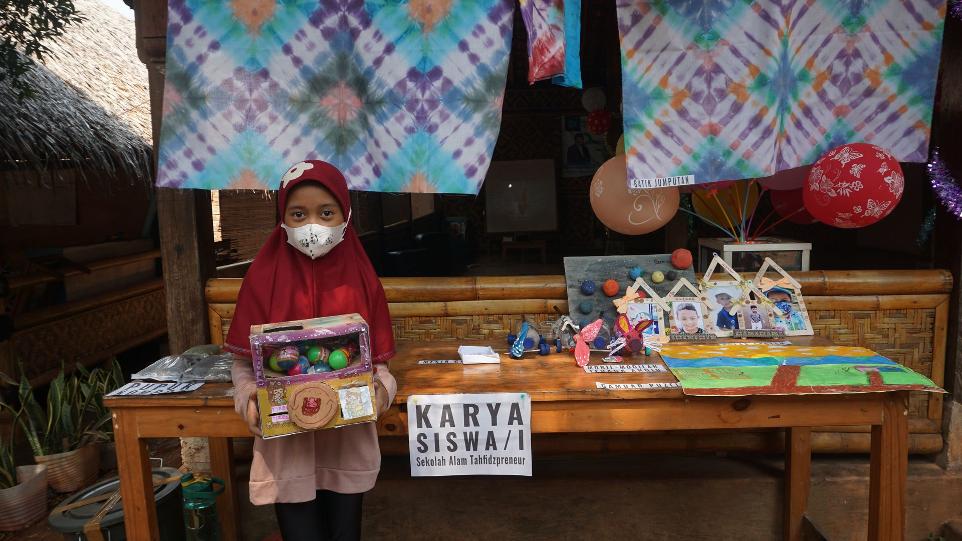 Siswa-siswi Sekolah Alam Tahfidzpreneur memamerkan sejumlah karya yang mereka buat selama tiga bulan pembelajaran. Karya tersebut diantaranya, batik, Kompos, dan kerajinan tangan dari kardus.