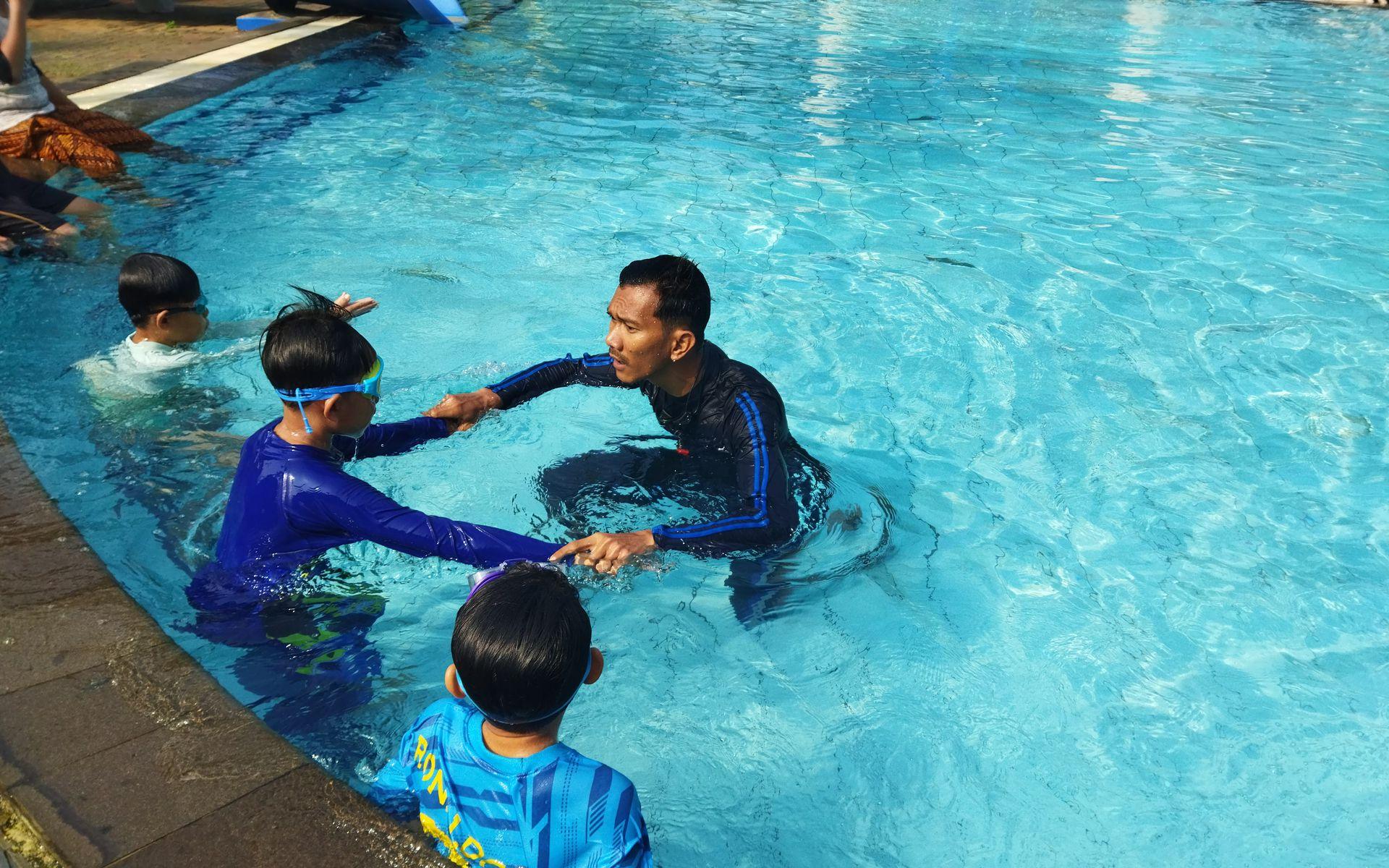 Anak-anak dilatih menunjukkan keahlian renang mereka di bawah bimbingan penuh perhatian. Ekspresi kegembiraan dan tekad tergambar jelas di wajah-wajah mereka, menciptakan atmosfer kebersamaan dan kegembiraan yang sulit untuk tidak terkesan. Pendampingan ini tidak hanya tentang teknik renang, tetapi juga melibatkan pembentukan karakter, teamwork, dan semangat kompetitif yang sehat.